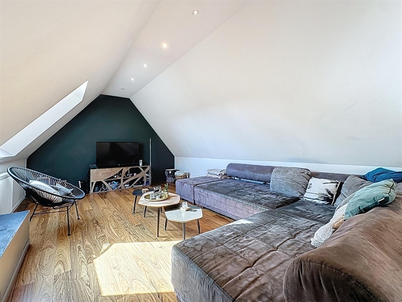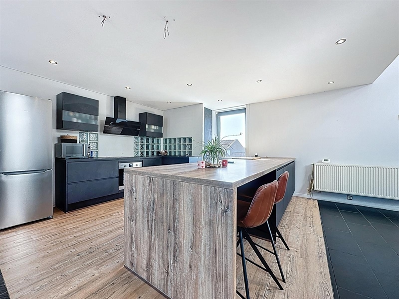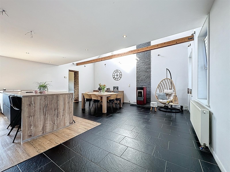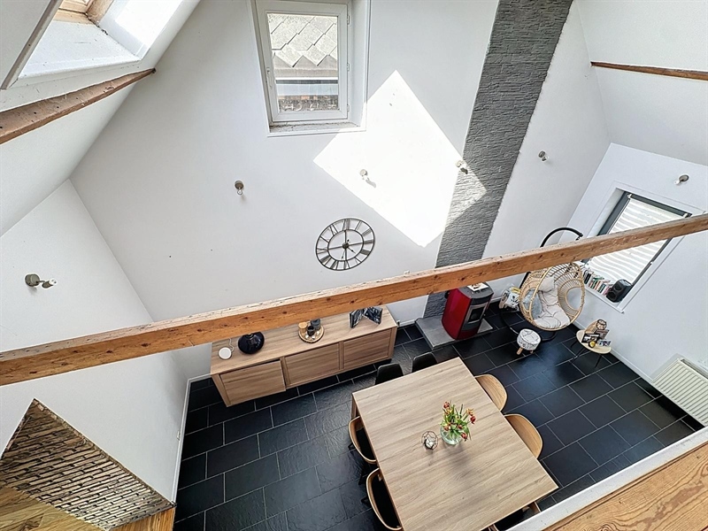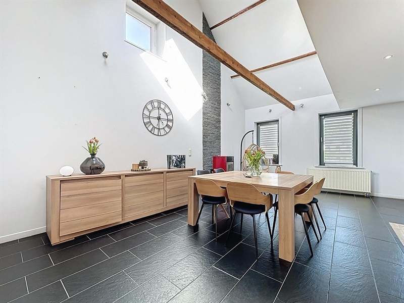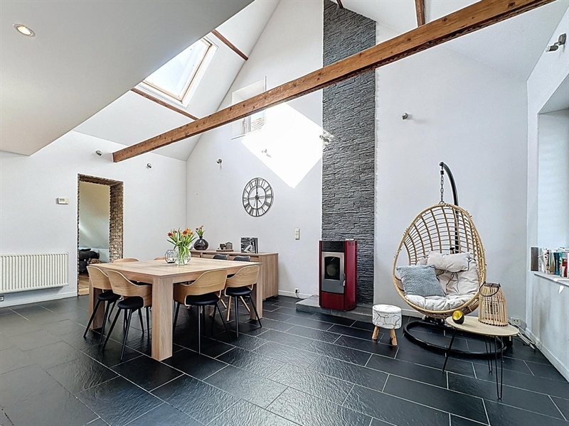Description : Situé en plein cœur du charmant village de Saint-Léger, ce magnifique duplex type loft séduit par ses volumes généreux, son cachet et sa lumière omniprésente. Dès l’entrée, une première terrasse vous accueille et donne accès à un hall menant à une cave. À l’étage principal, vous découvrirez une vaste salle à manger de plus de 25 m² ouverte sur une cuisine entièrement équipée de 30 m², le tout baignant dans une ambiance chaleureuse. L’espace se prolonge par un salon cosy de 38 m², parfait pour vos instants de détente. Sur ce même niveau se trouvent une première chambre avec accès direct à la salle de bain, un dressing, une buanderie, un WC séparé ainsi qu’une seconde terrasse en bois. À l’étage supérieur, un hall de nuit distribue une suite parentale lumineuse de plus de 25 m² et une troisième chambre spacieuse de 29 m². Côté technique, ce bien dispose de châssis PVC double vitrage, du chauffage central au gaz complété par un poêle à pellets, d’une électricité conforme jusqu’en 2040 et affiche un PEB de classe C. À seulement quelques pas du canal, ce cocon familial unique allie espace, confort et charme dans un environnement paisible et recherché.